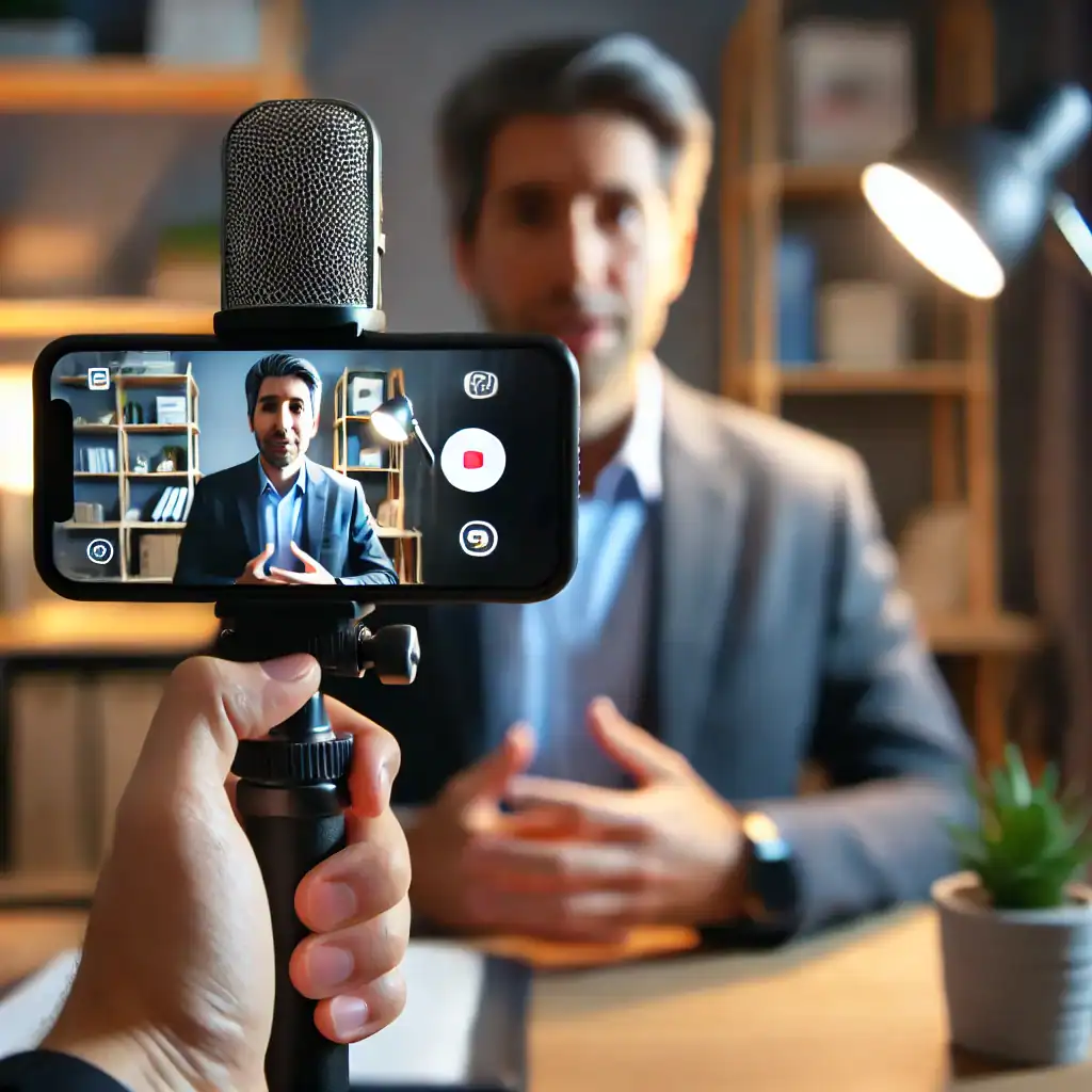 a person recording a man creating content with a cellphone and micrphone.